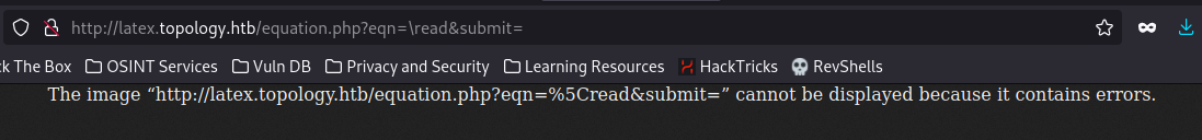 Interesting URL from the Latex Generator http://latex.topology.htb/equation.php?eqn=%5Cfrac%7Bx%2B5%7D%7By-3%7D&submit=