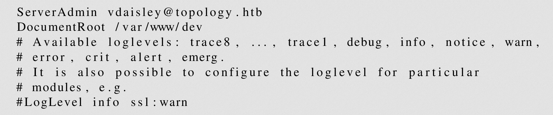 Since dev.topology is protected by a htaccess file, I checked the config for the default sites: /etc/apache2/sites-available/000-default.conf